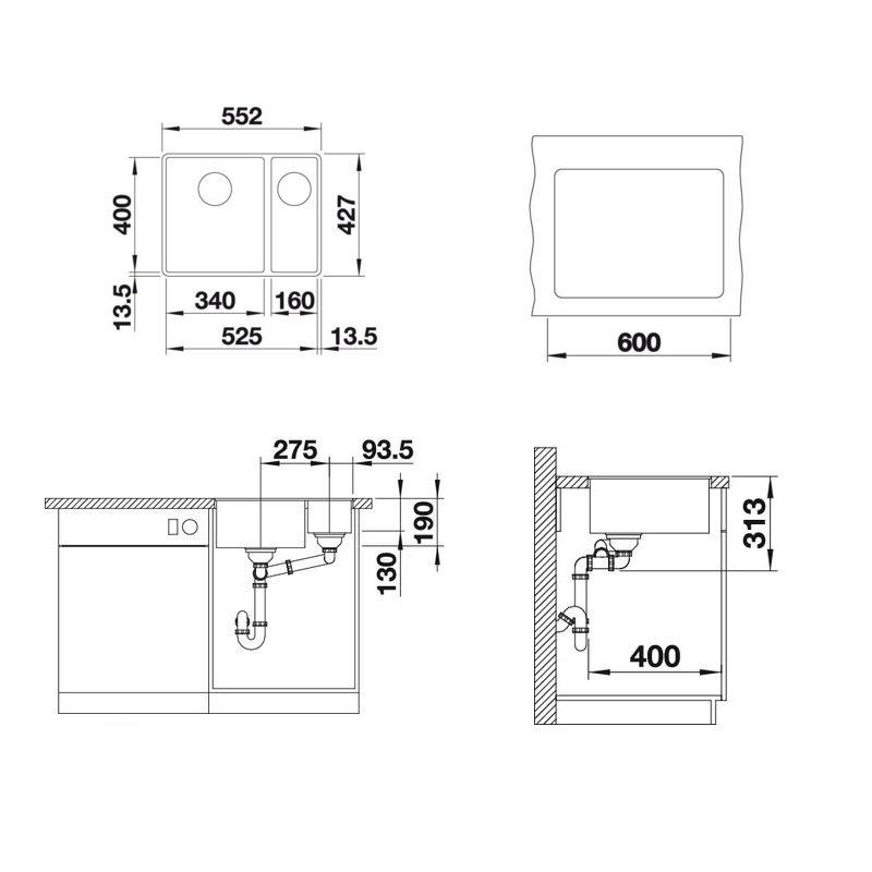 1) Мойка для кухни прямоугольная SUBLINE 340/160-F