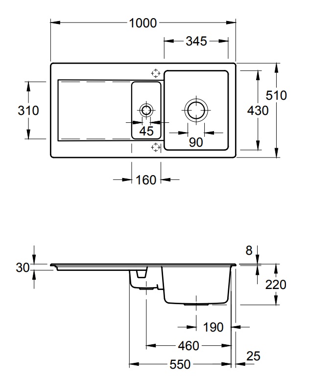 врезная в столешницу сверху, под столешницу