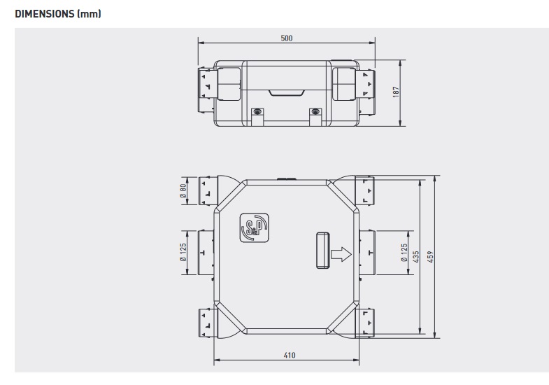 - Выходной воздух: 1 штуцер диаметром 125, с адаптером на Ø160.