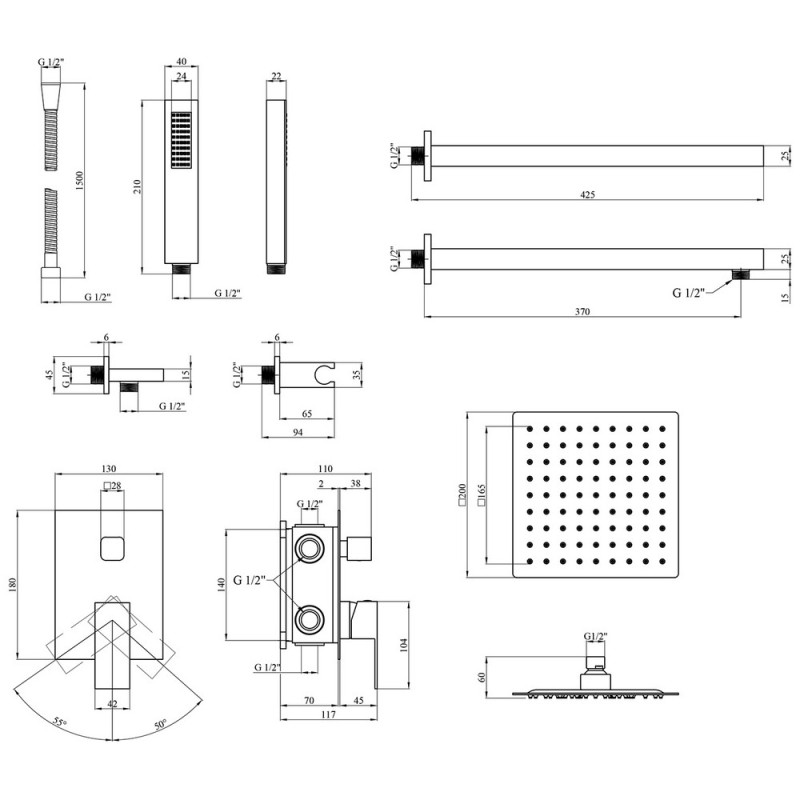 В комплекте имеется душевой гарнитур с душевым шлангом длиной 1500 мм. Диаметр подключения - 1/2''. Лейка имеет квадратную форму с диаметром 25 мм.