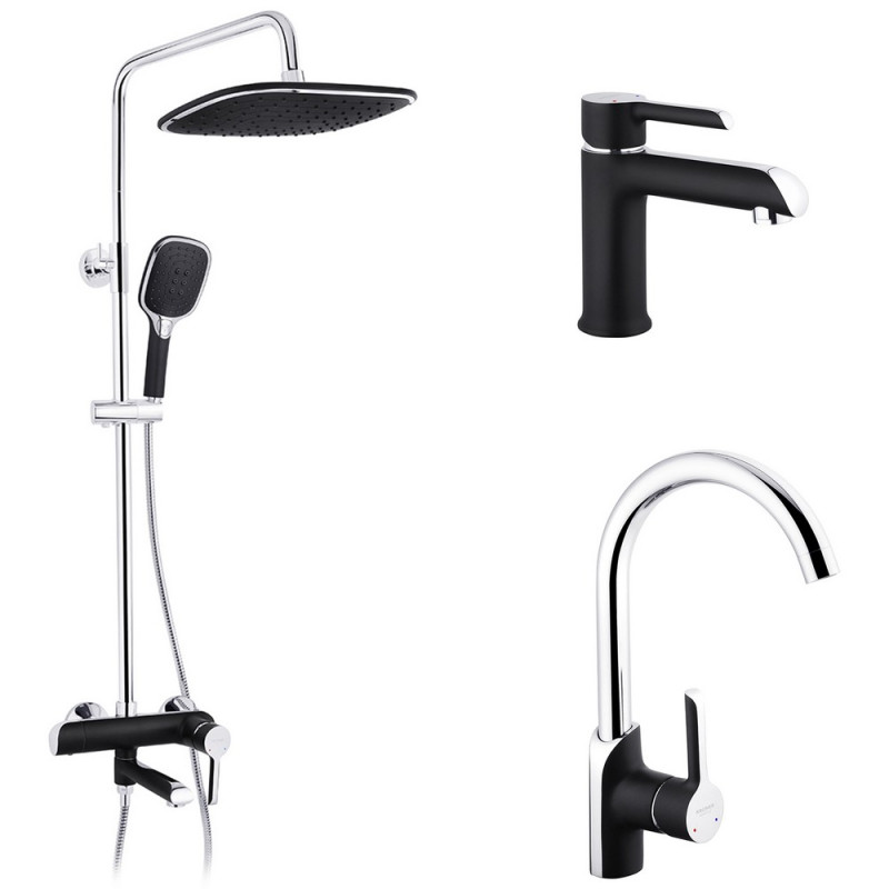 Набор 3 в 1 душевая система Kroner Essen-SCH063 + смеситель для раковины Essen-SCH030 + смеситель Essen-SCH010 хром/черный