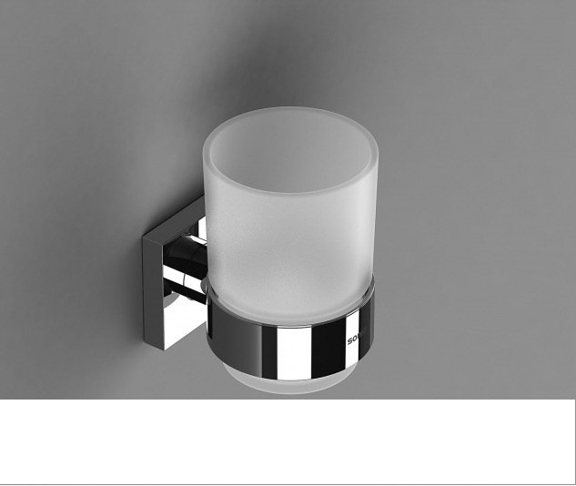 - Стакан для зубных щёток, с держателем. Хромированный держатель, настенный монтаж. Стакан из белого матового стекла. Габариты (ДШВ): 8,7х6,6x9,7 см.