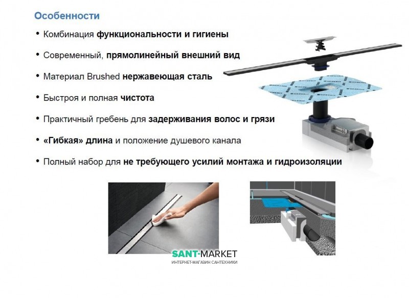 Душевые каналы Geberit CleanLine состоят из двух компонентов: видимый сборный коллектор, выполнен из нержавеющей стали. Ниже него находится монтажный комплект, который устанавливается как обычный трап.