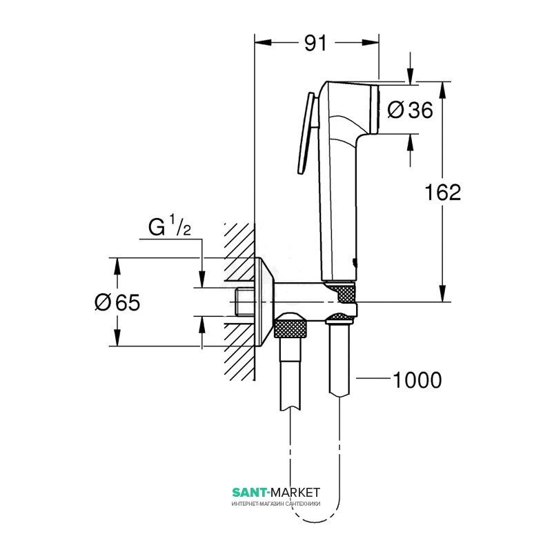 Tempesta-F Trigger Spray 30 Душевой набор с угловым вентилем, 1 вид струи включает в себя: ручной душ с клавишей управления (27512001) нажимной запорный вентиль, встроенный в держатель для душа Silverflex Longlife Душевой шланг 1250 мм (26335000) GROHE StarLight хромированная поверхность с системой SpeedClean против известковых отложений Внутренний охлаждающий канал для продолжительного срока службы Twistfree против перекручивания шланга минимальное давление 1,0 бар