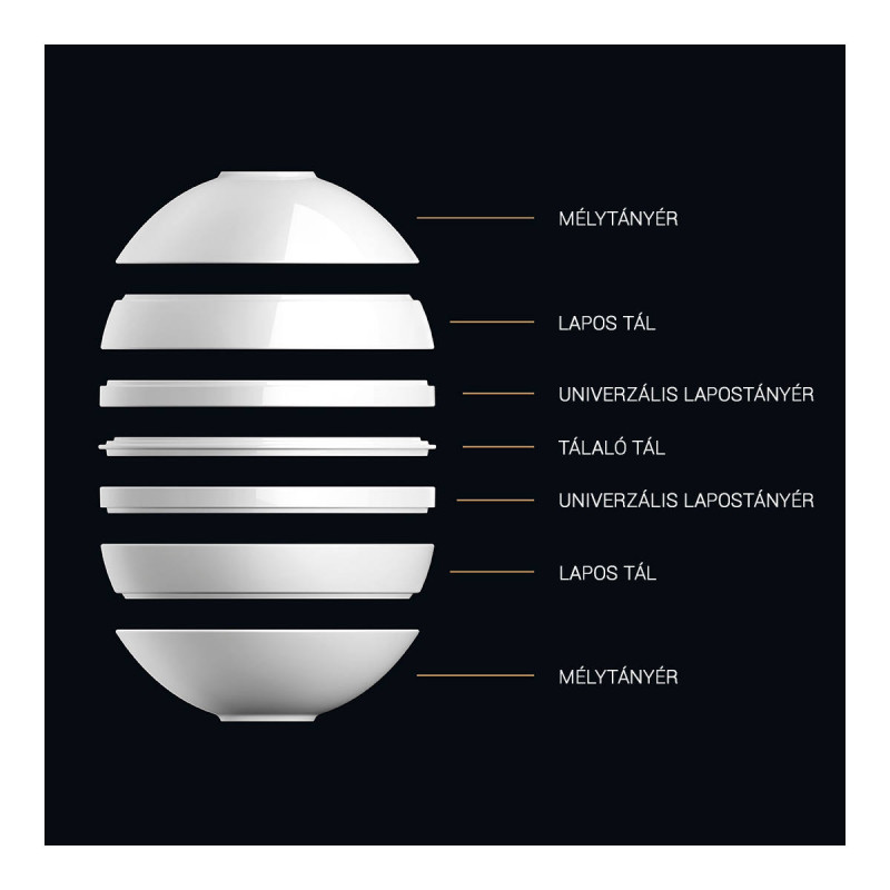 Набор La Boule впечатляет своим дизайнерским видом и потрясающей функциональностью. Сфера из фарфора премиум-качества состоит из набора предметов для двух персон: это две плоские тарелки, две универсальные тарелки, два салатника и блюдо для сервировки, которые волшебным образом соединяются и предстают в форме шара.