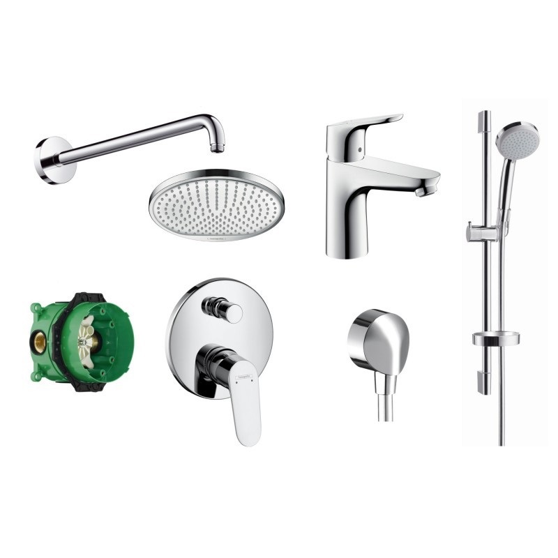 1. Верхний душ Hansgrohe Croma (2646400) Техническая информация для установки: размер душевого диска: 220 мм; тип струи: RainAir (дождевая струя, обогащенная воздухом); расход воды для струи RainAir (при 3 бар): 19 л/мин; полностью хромированный душевой диск; материал душевого диска: металл; съемный душевой диск для очистки; монтаж: со стены; Цвет душевого диска: белый. 2. Держатель для верхнего диска (27413000) Техническая информация для установки: Диаметр подсоединения: G 1/2; Материал: пластик; Длина держателя: 389 мм; Гарантия: 2 года. 3. Смеситель Focus E2 Hansgrohe - внешняя часть (31945000) Уровень сложности установки душевой системы: средний. Техническая информация для установки: Назначение: для душа; Материал: латунь; Диаметр: 150 мм; Цвет: хром. 4. Внутренняя часть для смесителя (01800180) Техническая информация для установки: Картридж: керамический; Материал: корозийно-устойчивая латунь; Глубина: 59 - 80 мм. 5. Душевой набор (26692400) Ручной душ Хансгрое Состоит из: Настенный держатель Porter`S (28331000): пластик; Ручная лейка Crometta Vario (26330400): Размер душа: 100 мм; Расход воды: 14 л/мин; Два типа струи: Rain, IntenseRain; Цвет душевого диска: белый; Гладкий шланг (28168000) Длина: 1600 мм. Материал: латунь, пластик, хром.