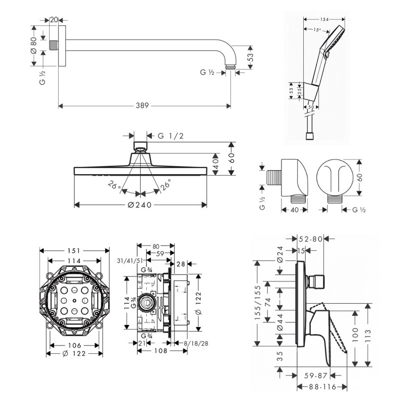 Представленный здесь душевой гарнитур для скрытого монтажа Talis E 71745222 от Hansgrohe, состоит из комплекта верхней монтажной части однорычажного смесителя для ванны скрытого монтажа Talis E 71745000 с переключателем ванна/душ, универсальной встроенной части смесителя iBox 01800180, верхнего душа Crometta S 26723000 с одним режимом струи и диаметром 24 см, душевого кронштейна 27413000 длиной 38.9 см, гарнитура Crometta Vario EcoSmart 26694400, состоящего из ручной лейки диаметром 10 см с двумя режимами струи, шланга длиной 160 см и настенного держателя, а также из шлангового подсоединения FixFit E 27454000 для душевого шланга 1/2".