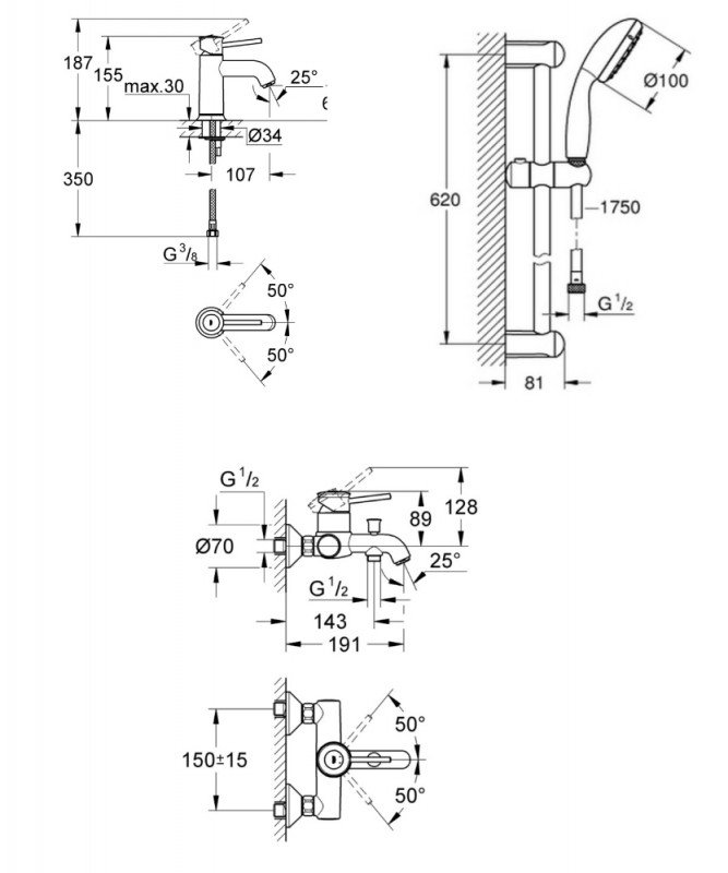 Набор смесителей для ванной Grohe BauClassic с душевым гарнитуром хром