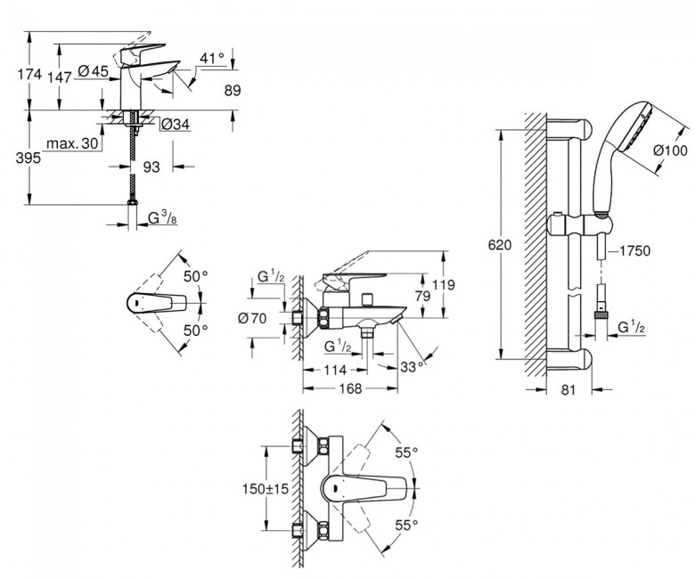 Набор смесителей для ванной Grohe BauEdge 3 в 1 с душевым гарнитуром хром
