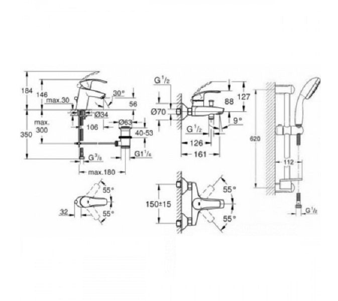 Комплект смесителей Grohe Eurosmart - это качественный многофункциональный набор, который способен создать красивый дизайн в едином стиле не только в ванной комнате, но и на кухне. Набор состоит из однорычажного смесителя для раковины, смесителя для ванны с автоматическим переключателем ванна/душ и с защитой от обратного потока, смесителя для кухни с высоким поворотным трубкообразным изливом, а также душевым гарнитуром, в состав которого входит ручной душ, штанга и мыльница. Все компоненты набора имеют ограничитель температуры и регулировку расхода воды. Благодаря уникальному хромированному покрытию с ослепительным блеском комплект будет иметь ослепительный вид даже после долгих лет эксплуатации. Такое покрытие обладает грязеотталкивающими свойствами, оно устойчиво к потускнению и появлению царапин.