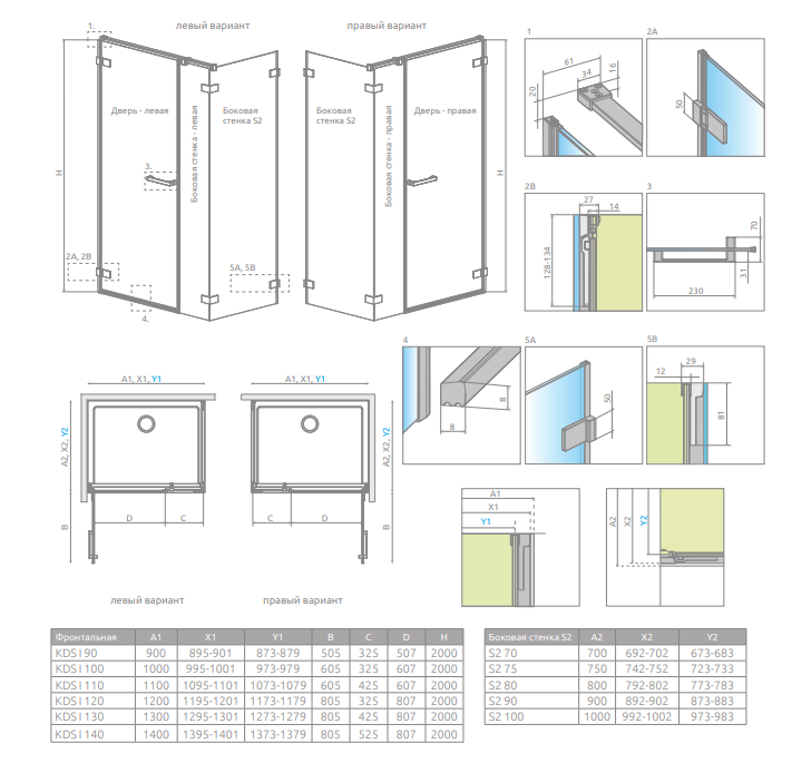 В заказе нужно указать 3 номера артикулов: фронтальной части кабины (два номера: створка двери и неподвожный элемент) и боковой стенки S2.