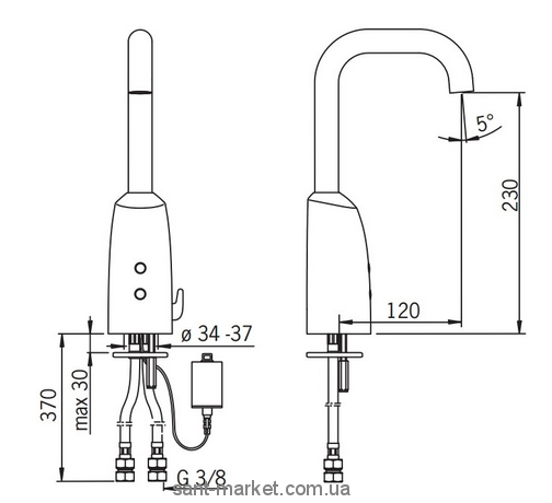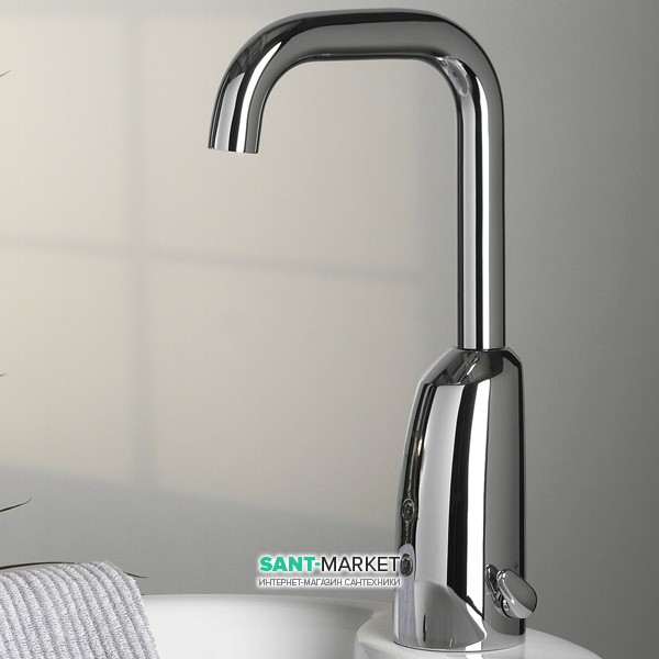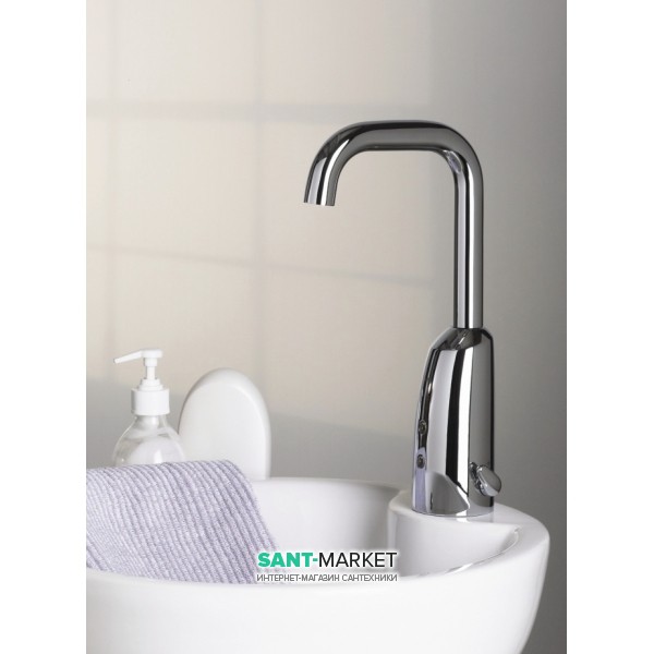 Бесконтактный смеситель для умывальника с рукояткой регулировки температуры. Работает от батареи 6В. Длина излива 120 мм. Смеситель оснащен грязевыми фильтрами и обратными клапанами. При установке смесителя не требуется настройка его параметров, поскольку в нем используется усовершенствованный датчик с системой Oras автофокус. По желанию потребителя заводские настройки могут быть изменены в соответствии с условиями места использования с предварительно запрограммированными параметрами. Клапан с импульсным управлением обеспечивает длительный срок службы батареи. Ограничитель расхода воды (6 л/мин) позволяет экономить воду (до 0.5 л при однократном использовании).