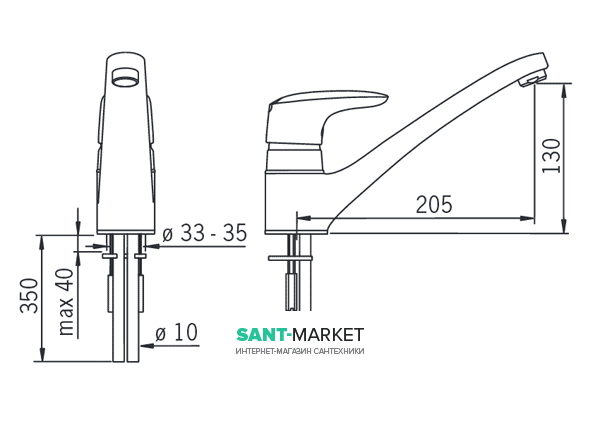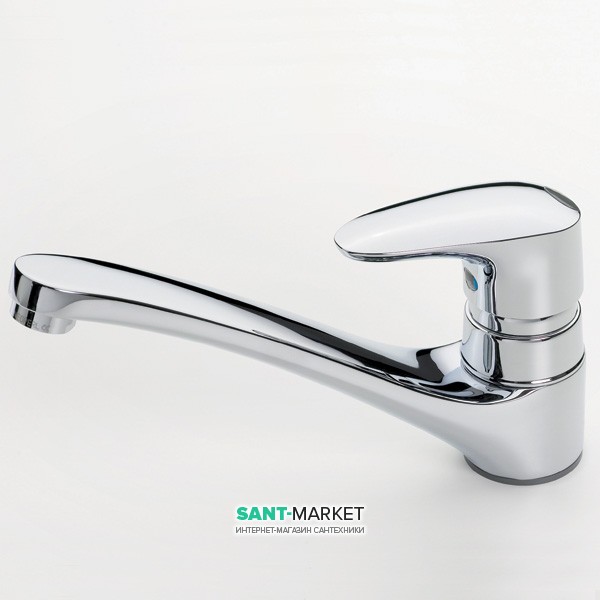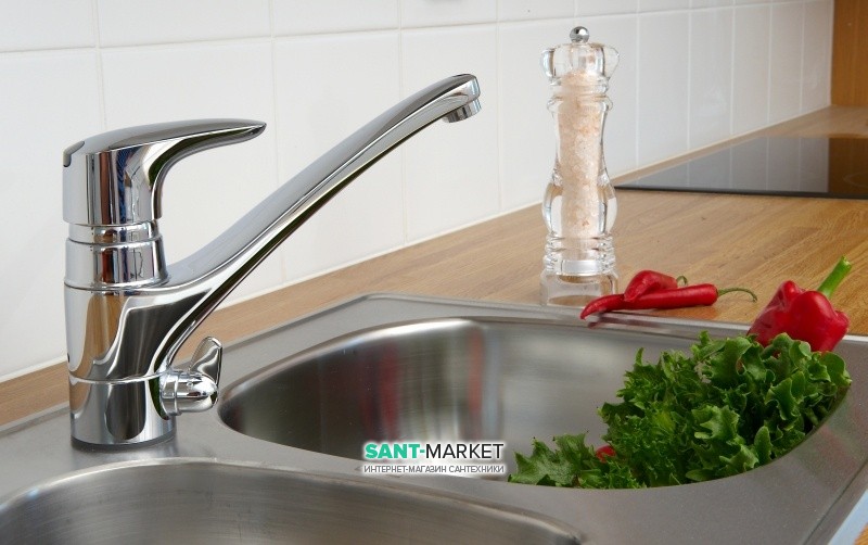 Смеситель для кухни с поворотным изливом. Угол поворота излива 100° (заводская установка), может быть изменен. Двухкомпонентная прочная рукоятка оснащена эко-кнопкой для ограничения расхода воды. При нажатии эко-кнопки расход можно увеличить.