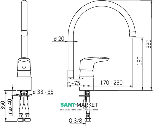 - Угол поворота излива 120° (заводская установка), может быть изменен.