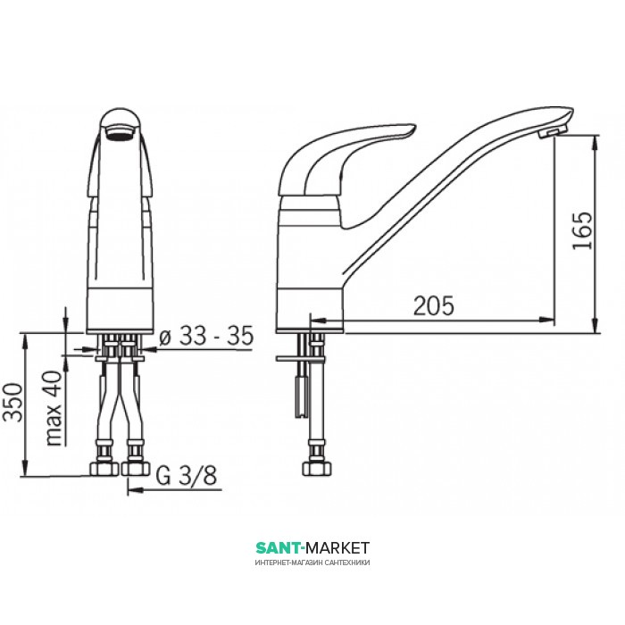 - угол поворота излива 100°C (возможно ограничить 40°C - 80°C)
