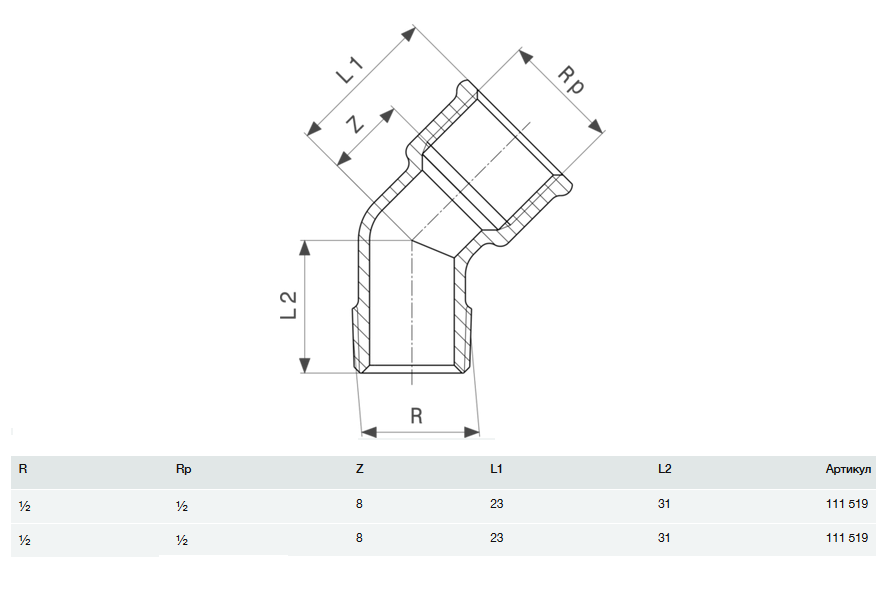 Отвод 45° Viega 1615 R½хRp½ латунь 111519