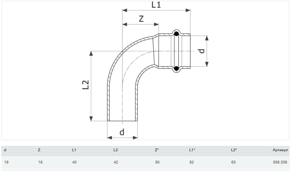 1) Отвод 90° Viega Prestabo 1116.1 18 нелегированная сталь