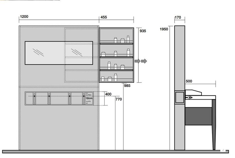Панель выпускается в тех же цветах, что и ножки (тёмный ясень и хемлок) и доступна в двух размерах: 120 см и 140 см. Панель имеет выдвижной ящик и крепёж для раковины. Зеркало не входит в комплект поставки.