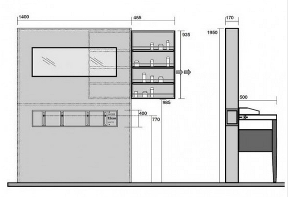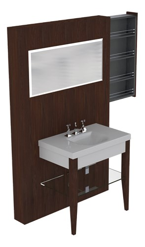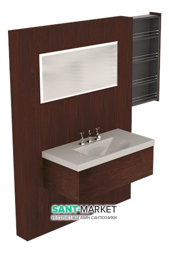 Панель выпускается в тех же цветах, что и ножки (тёмный ясень и хемлок) и доступна в двух размерах: 120 см и 140 см. Панель имеет выдвижной ящик и крепёж для раковины. Зеркало не входит в комплект поставки.