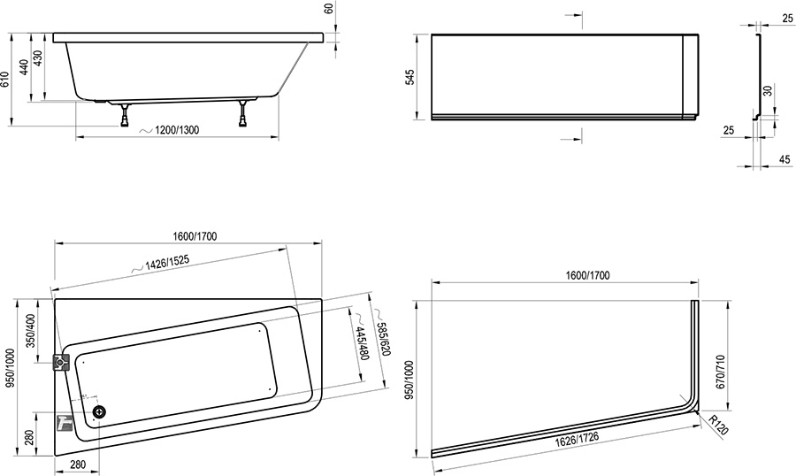 1) Панель для ванны Ravak 10° 170 L фронтальная левосторонняя