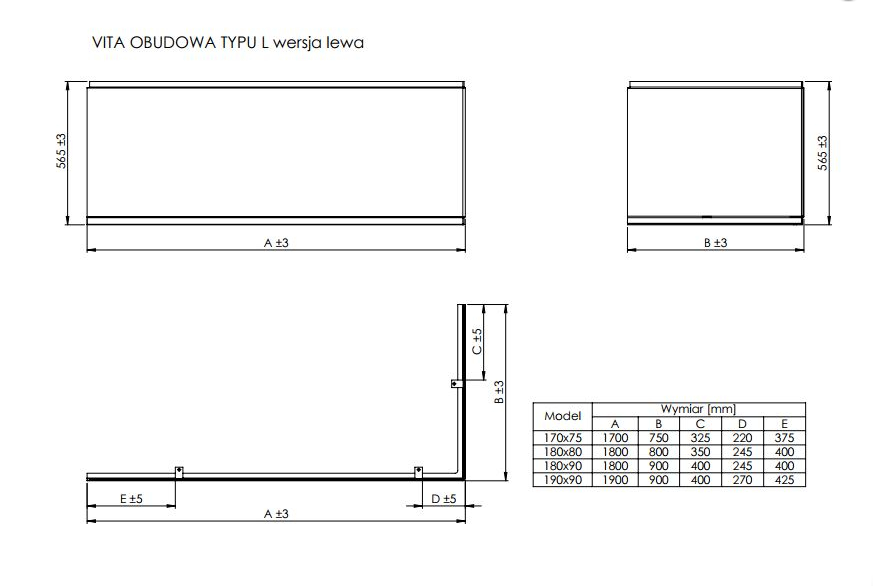 1) Панель для ванны Roca Vita левая 190 см акрил белый
