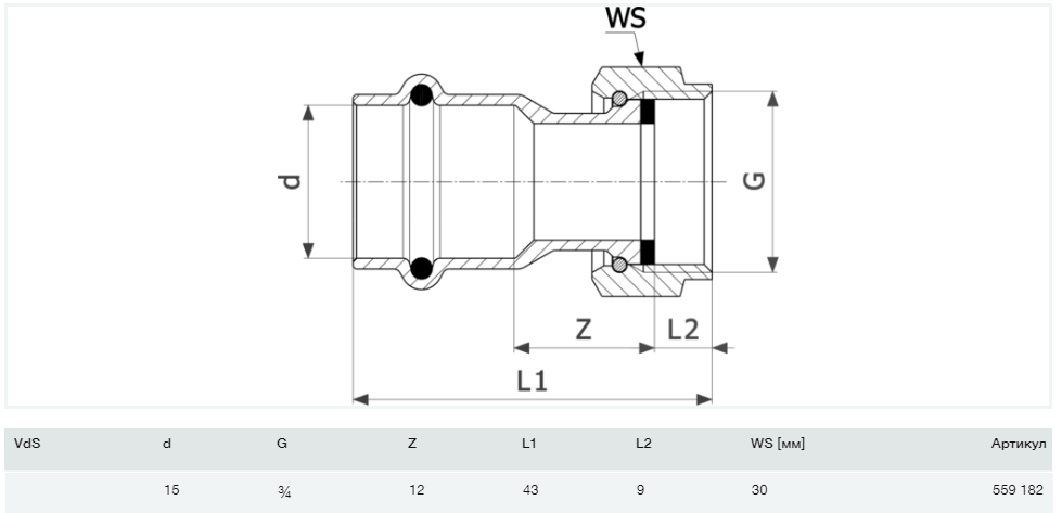 Переход на резьбовые соединения Viega Prestabo 1163 15хG3/4 нелегированная сталь