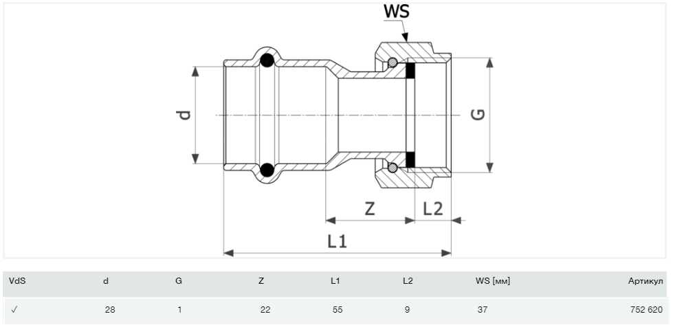 Переход на резьбовые соединения Viega Prestabo 1163 28хG1 нелегированная сталь