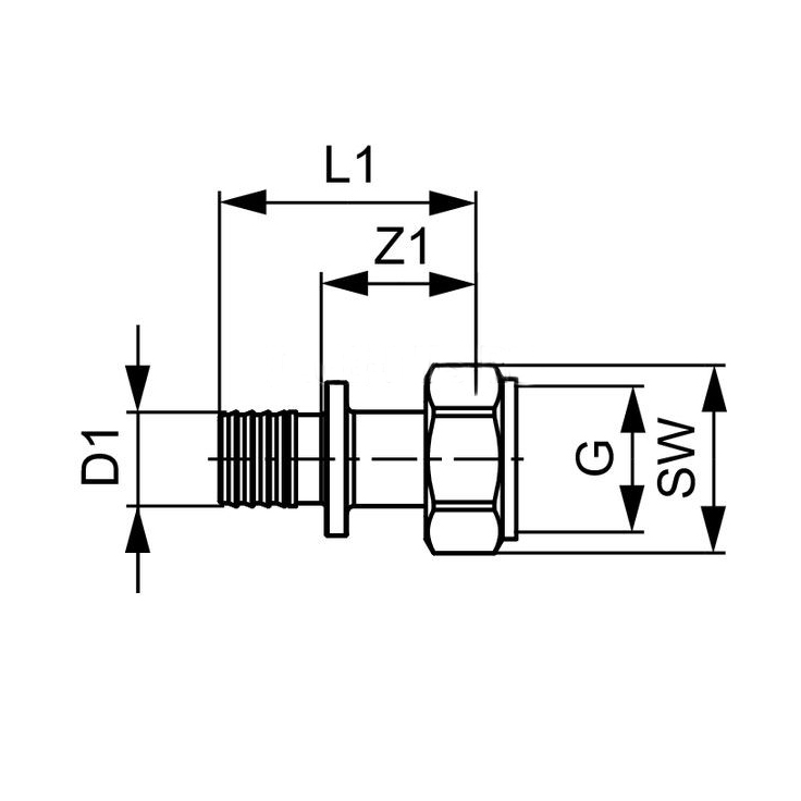1) Переходник прямой Tece TECEflex с накидной гайкой и торцевым уплотнением бронза 25х1"