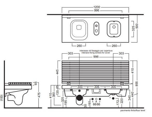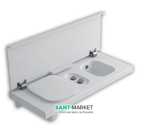 Многофункциональная скамейка с унитазом и биде без перелива, левая версия (унитаз слева). В комплекте с биде смеситель с двойным притоком, дистанционной кнопкой. Белая лакированная крышка, с мягким закрытием. Монтаж специальным кронштейном для кирпичных стен, или с специальным правым / левым кронштейном для стены из гипсокартона, можно совместить со сливным бачком Geberit “Sigma 8”. Можно интегрировать с белым шкафом.