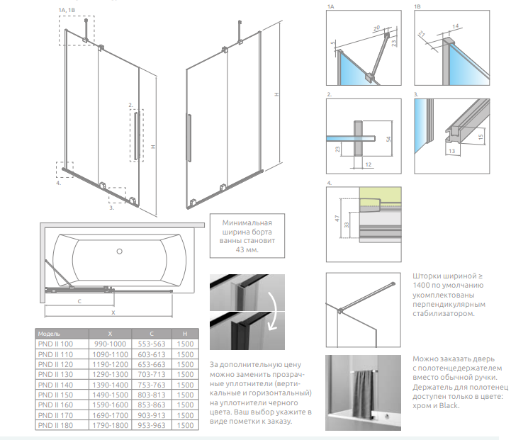 - Минимальная ширина борта ванны 43 мм.