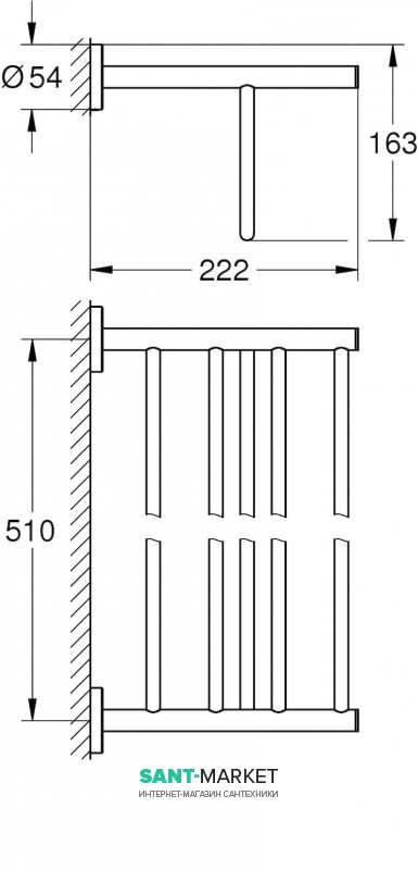 Ширина 510 мм, высота 163 мм, глубина 222 мм. В цвете хром.