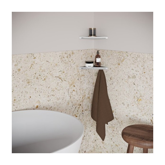 Прямая поверхность полки перфорированная, чтобы вода не оставалась на поверхности, но все же обеспечивала устойчивость расположенным предметам. В середине полки прикреплены три нижних крючка, на которых держится даже более тяжелый предмет, например, фен. Соединив два или более единиц полок, вы добьетесь эффективного комплекта с дополнительной зоной хранения. Мы рекомендуем сочетать с прямой полкой Slim S.