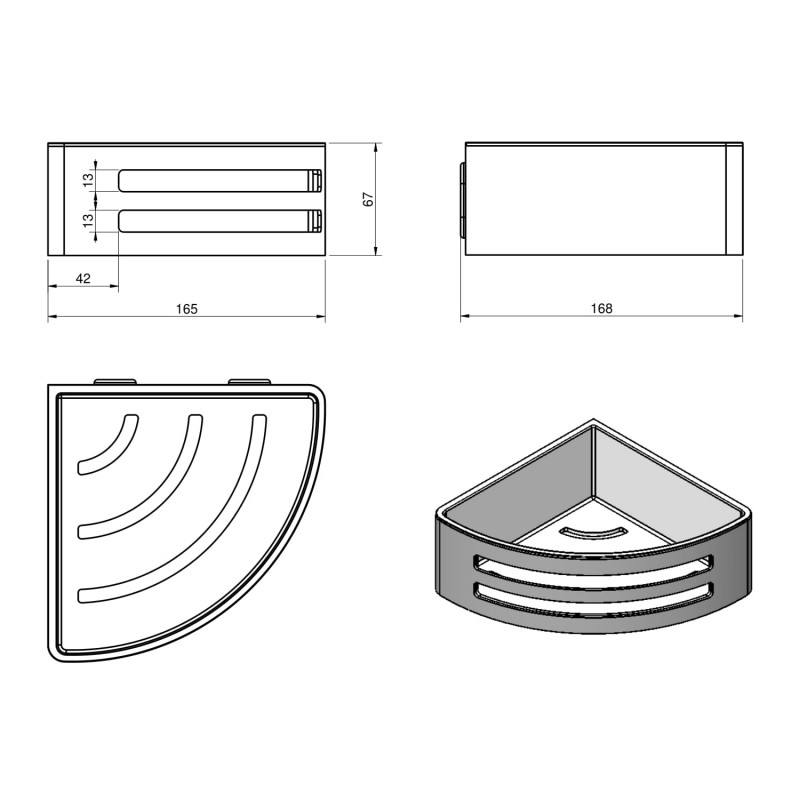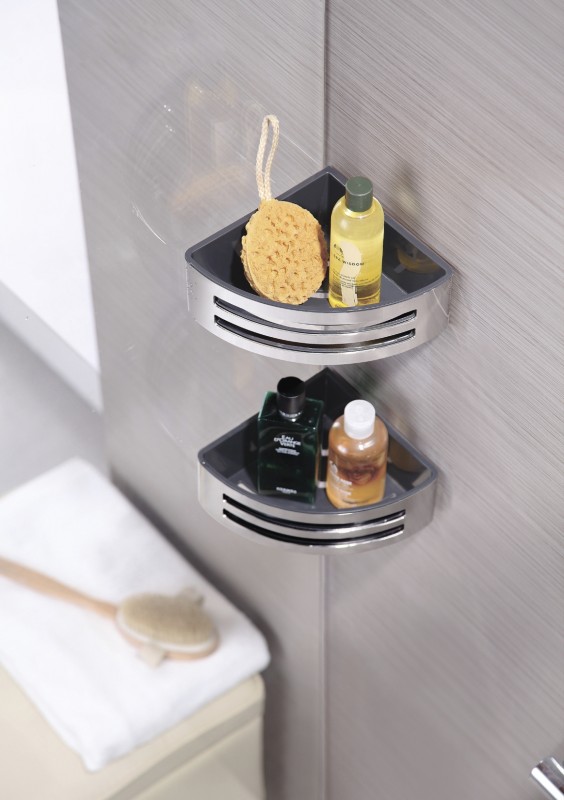 Угловая полочка для ванной 15-88-756 серии Teo крепится в углу ванной комнаты или душевой кабины, тем самым занимая мало места.