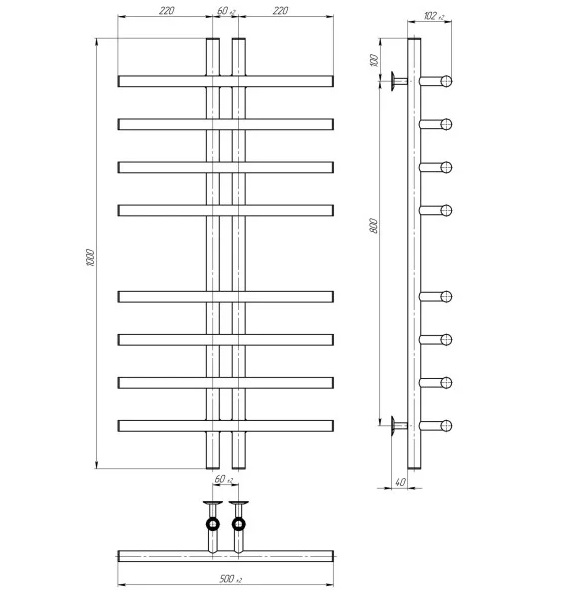 Полотенцесушитель водяной Deffi Gray П8 60х1000 нижнее подключение черный A.GY.100.6.8.B.A
