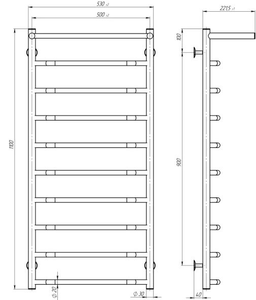 Полотенцесушитель водяной Deffi Трапеция с полкой П11 500х1200 боковое левое подключение белый