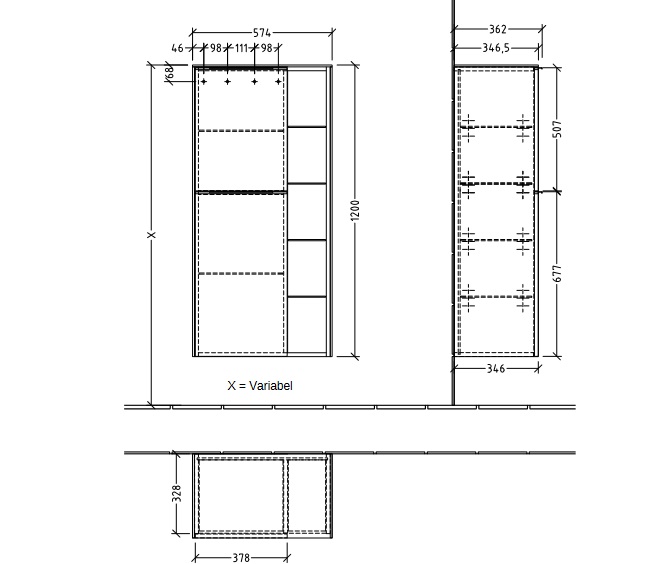 2 дверцы, 1 открытая полка справа, 6 стеклянных полок