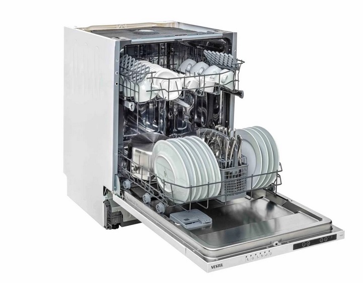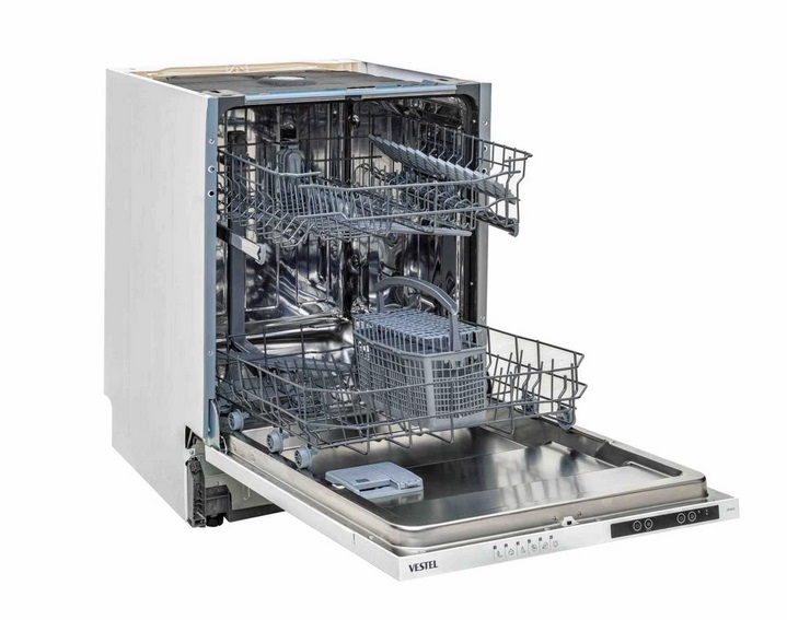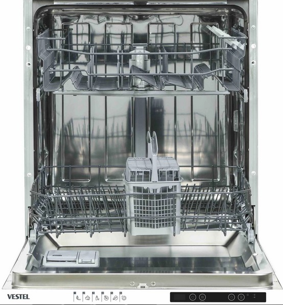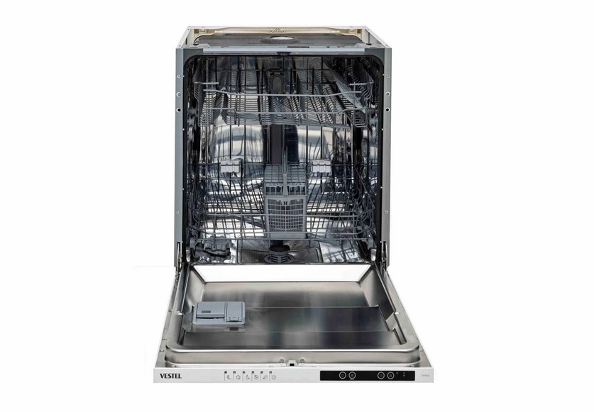 Встроенная модель Vestel свободно вмещает до 12 предметов посуды. Управление осуществляется с помощью кнопок. Посудомоечная машина поддерживает 4 настраиваемых температурных режима на 40, 50, 65 и 70°C. Модель оснащена тремя фильтрами: основным из металла, для грубой очистки и микрофильтром. Внутренняя камера изготовлена из высококачественной нержавеющей стали. Детали состояния посудомоечной машины выводятся на дисплей LED. Класс энергоэффективности модели — А++.