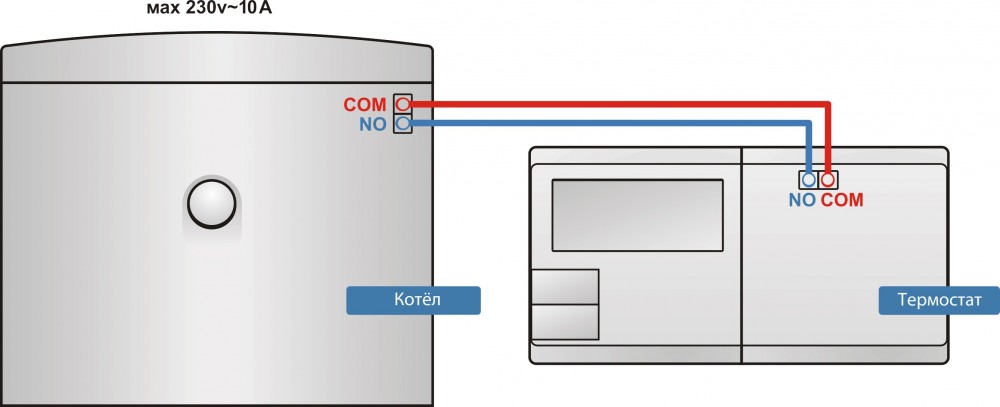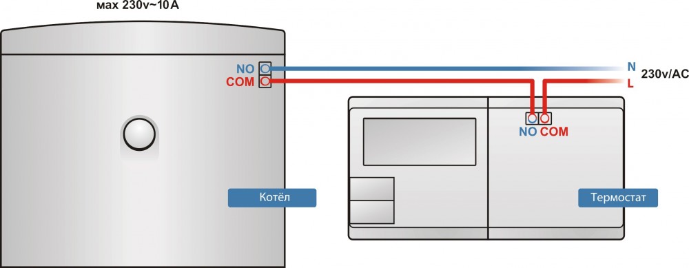 Терморегулятор имеет беспотенциальные контакты реле, что позволяет использовать его для управления, практически, любыми газовыми и электрическими котлами, которые имеют клеммы для подключения комнатного термостата. Также возможна работа с другими нагревательными приборами и кондиционерами.