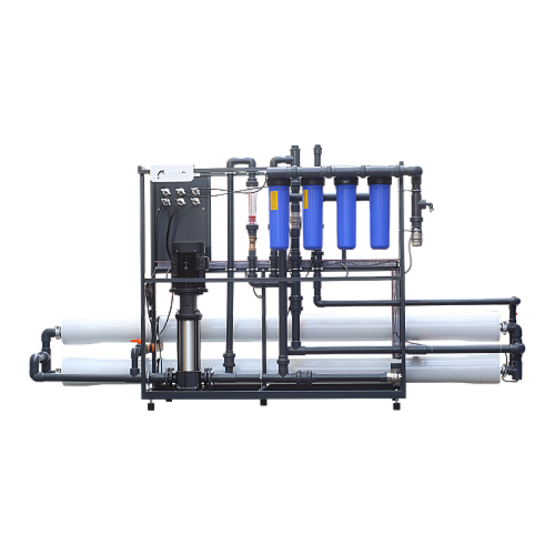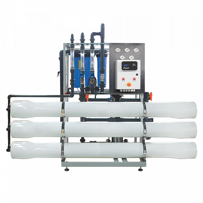 Поступающая в систему обратного осмоса вода проходит предварительную очистку на картриджных фильтрах тонкой очистки 5 мкм, входящих в комплект установки. На мембранный модуль вода подаётся насосом высокого давления. В рабочем режиме в мембранном модуле установки происходит разделение воды на два потока: деминерализованная вода – пермеат и вода с повышенным солевсодержанием – концентрат. Часть концентрата при работе модуля сбрасывается в канализацию, а часть направляется на вход насоса высокого давления, обеспечивая так называемый рецикл концентрата. В поток входной воды может дозироваться антискалант, препятствующий образованию отложений внутри мембранных элементов.