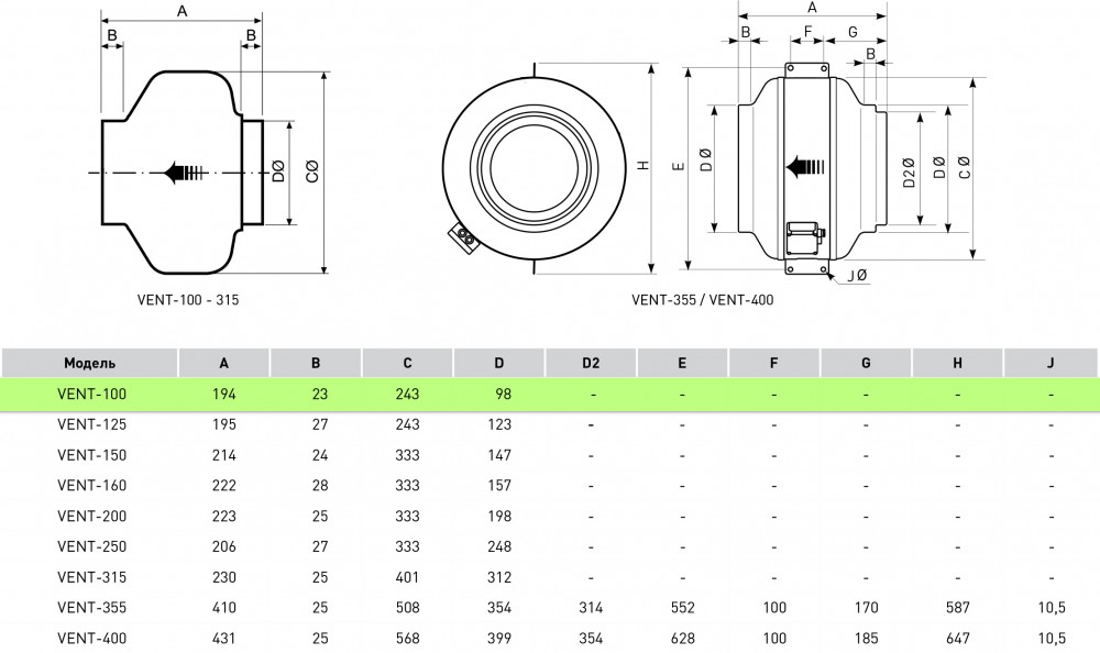 Круглые канальные вентиляторы серии VENT предназначены для использования в системах вентиляции небольшой и средней производительности. Вентиляторы выпускаются в двух вариантах: “L“ - вентиляторы повышенной производительности и “B“ - модели стандартной производительности с пониженным уровнем шума. Корпус вентиляторов от 100 до 355 тип-размера изготавливается из оцинкованной листовой стали. Корпус моделей 355 и 400 изготавливается из листовой стали и защищен от коррозии катафоретическим покрытием и черной полиэфирной краской. Все вентиляторы оснащаются электродвигателями с внешним ротором и рабочими колесами с загнутыми назад лопатками. Рабочие колеса у моделей 100 - 160 изготавливаются из высокопрочного пластика, у остальных моделей из стали. Вентиляторы комплектуются вынесеной клеммной коробкой и монтажным кронштейном.