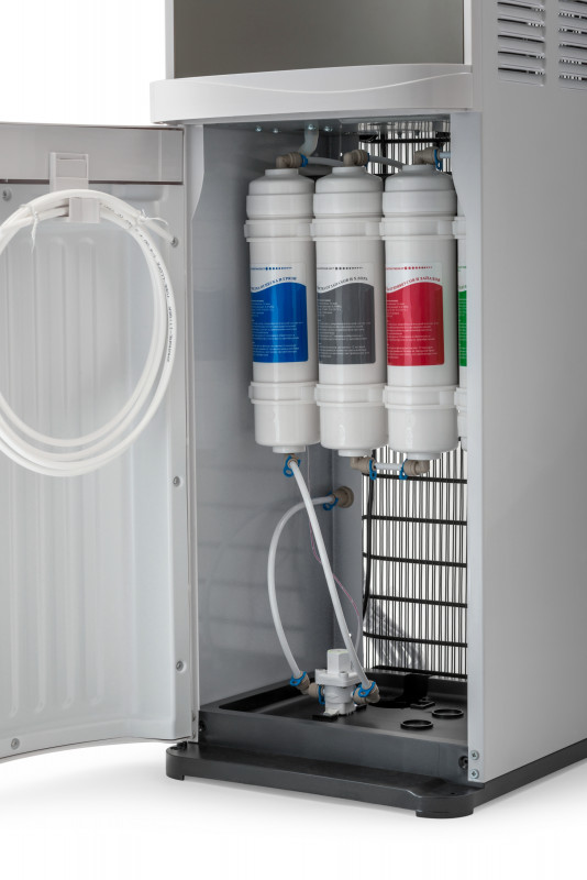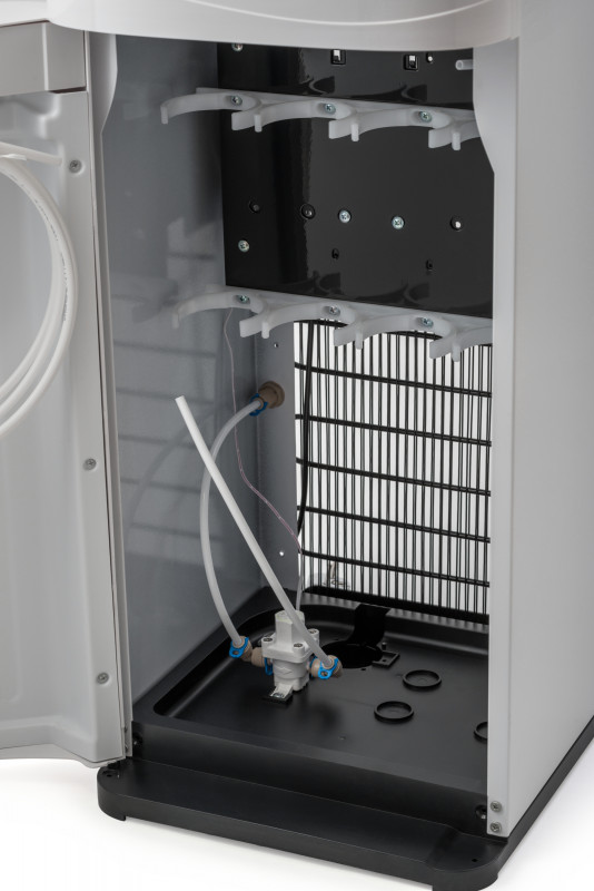 Вода из водопровода по трубке попадает в систему фильтрации и проходит очистку. Далее очищенная вода попадает в резервуар для чистой воды, расположенной под верхней крышкой пурифайера. Из резервуара вода поступает в баки холодной и горячей воды. Температура в баках горячей и холодной воды поддерживается на постоянном уровне с помощью электронных датчиков, что позволяет получать незамедлительный доступ к холодной и горячей воде.