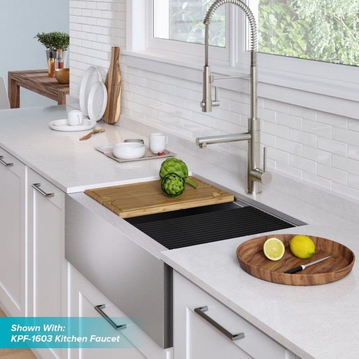 Сделайте больше с Kore - идеальной раковиной для современного домашнего шеф-повара. Вдохновленная профессиональными кухнями, рабочая станция Kore ™ мгновенно превращает вашу кухонную раковину в подготовительную станцию с полным обслуживанием. Эта фермерская раковина с впечатляющим плоским дизайном спереди создает очаг с характерным современным обликом. В комплекте с высококачественными аксессуарами, такими как универсальная подставка для сушки посуды и бамбуковая разделочная доска, встроенная система выступов позволяет мыть и сушить, а также измельчать и нарезать ломтиками, не теряя ни дюйма пространства. Изготовлена из нержавеющей стали 16-го калибра, является одной из самых прочных и долговечных раковин на рынке. Усовершенствованный современный и вдохновленный кулинарией дизайн - это мгновенная модернизация любой домашней кухни. Поднимите функциональность вашей кухонной раковины на совершенно новый уровень с серией WORKSTATION Kore ™ и ощутите разницу Kraus.