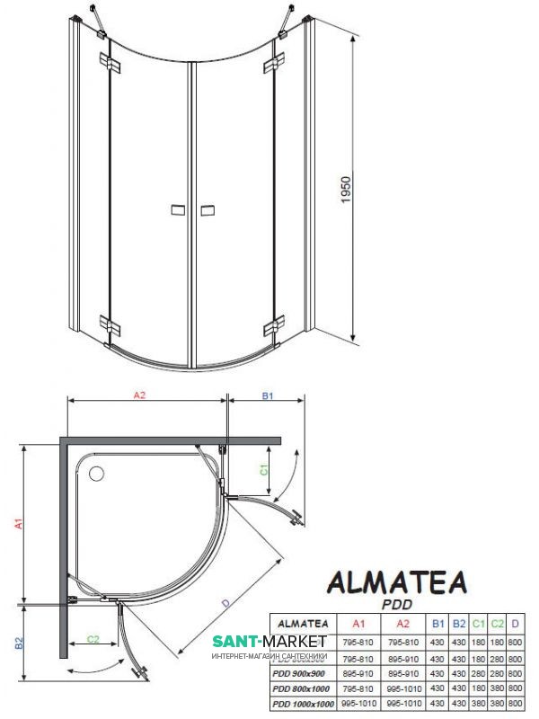 Кабины серии Almatea допускается устанавливать как на поддоны, так и непосредственно на пол. Особое внимание стоит обратить на высоту кабины – 1950 мм. Благодаря этому кабины хорошо смотрятся на низких поддонах. Квадратная кабина с двустворчатой дверью и узкими боковыми стенками. Дверь открывается наружу кабины создавая широкий и удобный вход. Дверь подвешена на латунных, хромированных петлях с подъемно-опускным механизмом и системой позиционирования двери. Кабина доступна в правом и левом вариантах.