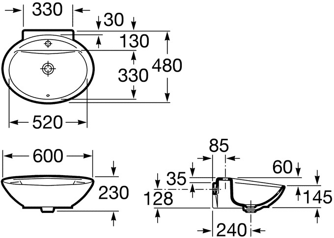 1) Раковина-чаша для ванной подвесная/накладная Roca Fontana 60x48 см керамика белая
