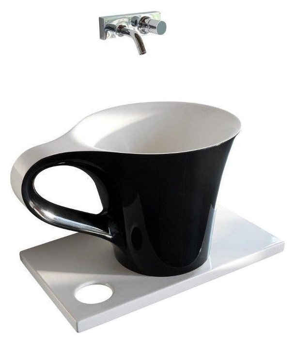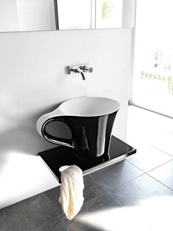 Раковина ArtCeram Cup выполнена в форме большой керамической чашки с ручкой. Она устанавливается на специальную подвесную столешницу. Раковина может быть полностью белой, а также с белой внутренней и черной наружной поверхностью.