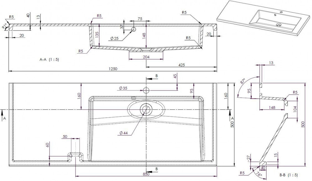1) Раковина для ванной Fancy Marble Peggy 125х50 см правая искусственный камень белый матовый