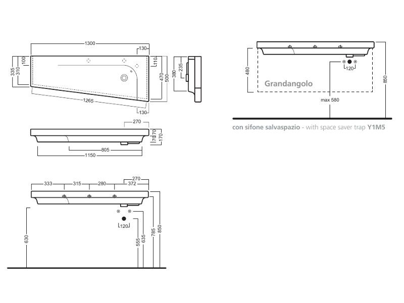 Раковина для ванной Hatria Grandangolo Т правая 130х50 см керамика белый глянцевый 00Y0XT01