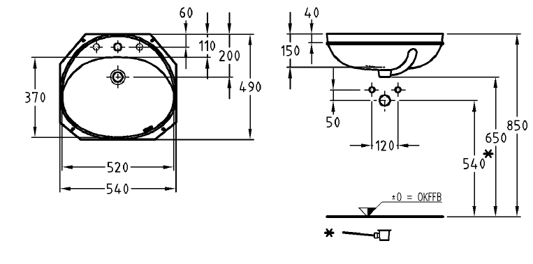- Встраиваемая (монтируется под столешницу) раковина с отверстием под смеситель