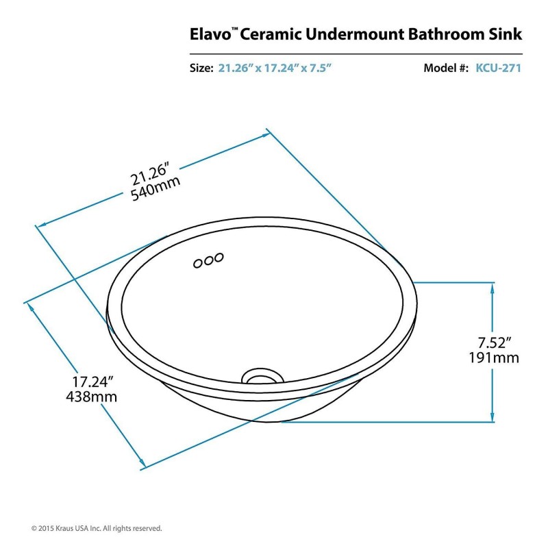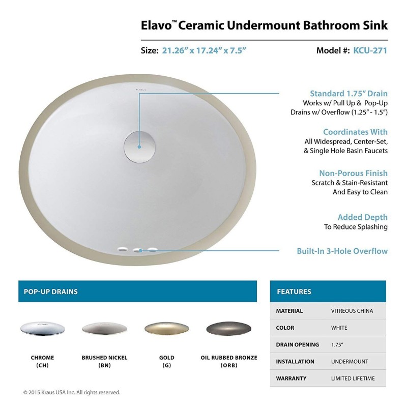 Серия Elavo ™ включает в себя керамические раковины, которые подходят для любого интерьера, с возможностью использоваия различных типов установки. Модели для установки на поверхность столешницы обеспечивают привлекательный внешний вид, идеально подходят для модернизации и ремоделирования интерьера ванной комнаты, превосходно дополняют современный интерьер. Элегантный керамический умывальник Kraus KCU-271 ELAVO выглядит, скорее, как часть декора, нежели привычный бытовой предмет. KCU-271 ELAVO - это овальная керамическая раковина с тремя отверстиями для перелива и дополнительной глубиной для предупреждения разбрызгивания воды. Монтируется под столешницу
