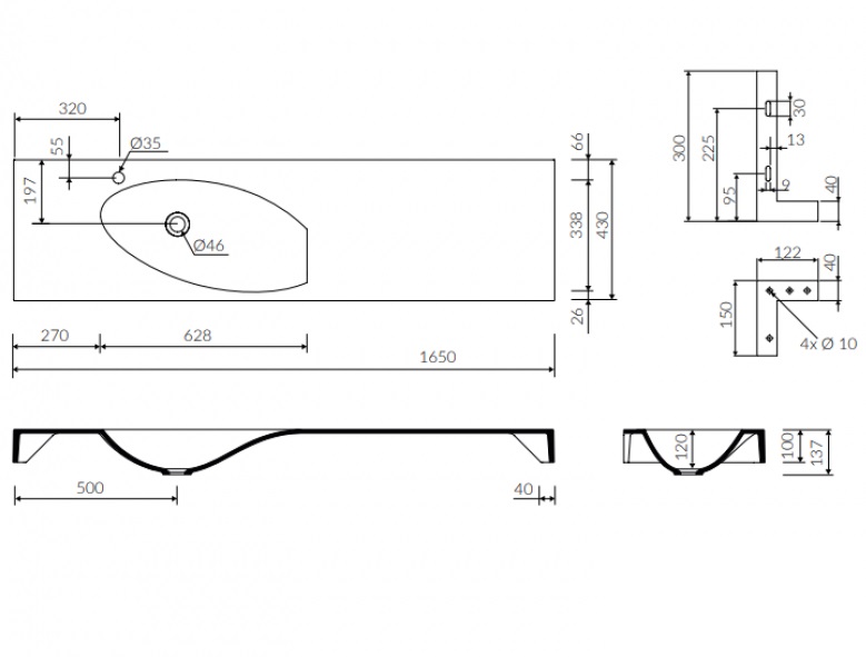 Раковина для ванной Marmorin Ugo 165х43 см левосторонняя литой камень белый P_U_528_02_1650